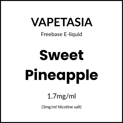 Vapetasia Salts$24.95 NZD$24.95 NZD $24.95 NZDCurrent price $24.95 NZD| /No reviewsPreviously known as Iced white gummy Get ready for a cool breeze on your tropical pineapple expedition. This Iced Sweet Pineapple is hard to put down!